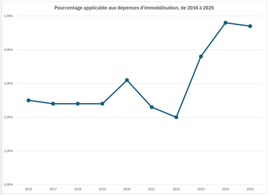 Les dépenses d’immobilisation, qui représentent les dépenses encourues pour des réparations majeures, des améliorations majeures ou la mise en place de nouveaux services, accessoires ou dépendances18, peuvent avoir un impact majeur sur le loyer. Dans le cadre de la méthode de fixation de loyer, ces dépenses ne sont pas intégrées au loyer d’un coup et sont plutôt amorties sur plusieurs années, selon un pourcentage qui variait d’année en année, en fonction des taux d’intérêt en vigueur19. Pour 2025, ce pourcentage était de 4,7 %. Cela veut donc dire que si un locateur dépense 10 000 $ en immobilisations, il peut appliquer 470 $ (donc 4,7 %) de hausse de loyer totale pour l’immeuble pour l’année. Cette hausse est ensuite répartie entre les locataires qui sont touchés par la dépense20. Alors qu’il a été relativement stable pendant plusieurs années, ce pourcentage a considérablement augmenté dans les années qui ont suivi la pandémie de COVID-19, tel que le démontre le graphique 2.